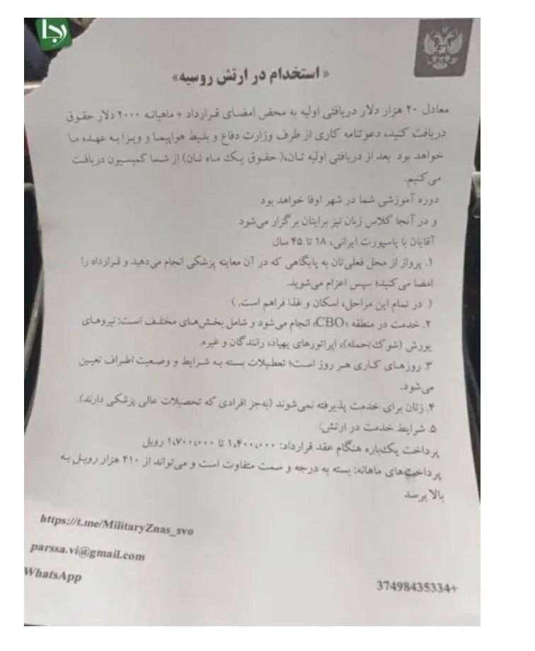Earlier this month, flyers circulated near the Russian Embassy in Tehran targeting men aged 18 to 45, offering financial incentives to join the Russian army. The leaflets promised signing bonuses of between $15,000 and $18,000, monthly salaries ranging from $2,500 to $2,800, as well as free housing, medical care, and military uniforms.