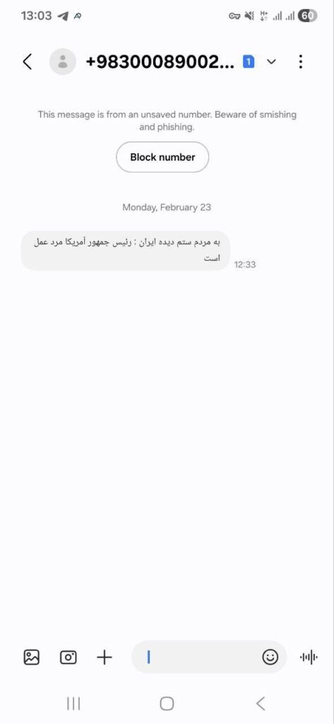 NEWS Mysterious Mass Text Message Sent Across Iran Hussain Hazbavi February 24, 2026 1 minute read An anonymous text message has been sent to hundreds of thousands of mobile phones across Iran. The message reads: “The U.S. president is a man of action; wait and see.” Post navigation Previous: Iran Protest Case: Father Sentenced to Death, Daughter Given 25 Years in PrisonNext: 18-Year-Old Ahmad Hizbawi Arrested in Al-Khalidiya قصص ذات الصلة NEWS 18-Year-Old Ahmad Hizbawi Arrested in Al-Khalidiya Hussain Hazbavi February 25, 2026 0 NEWS Iran Protest Case: Father Sentenced to Death, Daughter Given 25 Years in Prison Hussain Hazbavi February 23, 2026 0 NEWS Arrested Protester Dies Weeks After Alleged Torture in Custody Hussain Hazbavi February 23, 2026 0